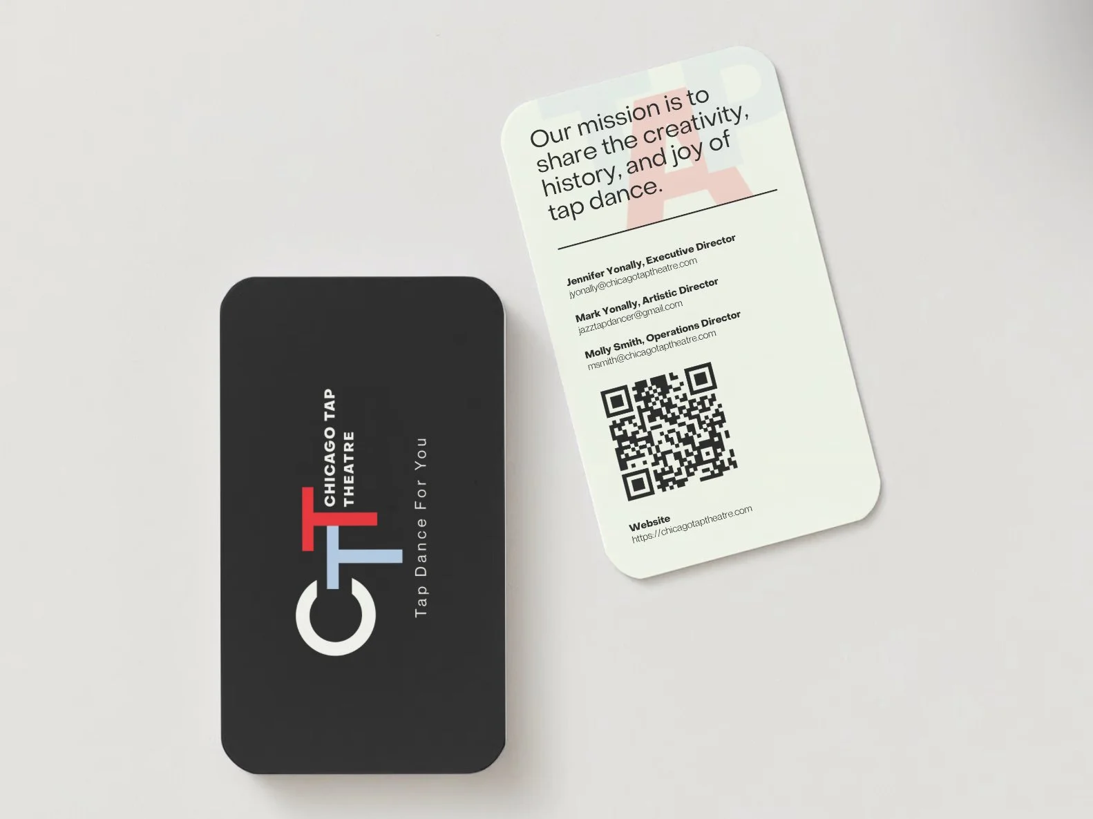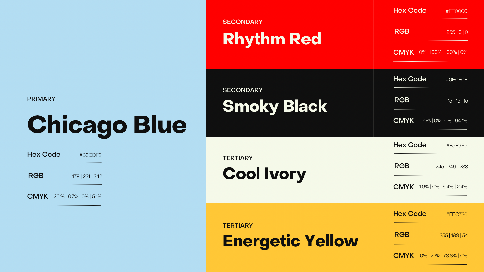 The Chicago Tap Theatre brand is underpinned with a color palette designed to be distinctive while representing the heart of Chicago and the joyous and energetic spirit of tap dance.