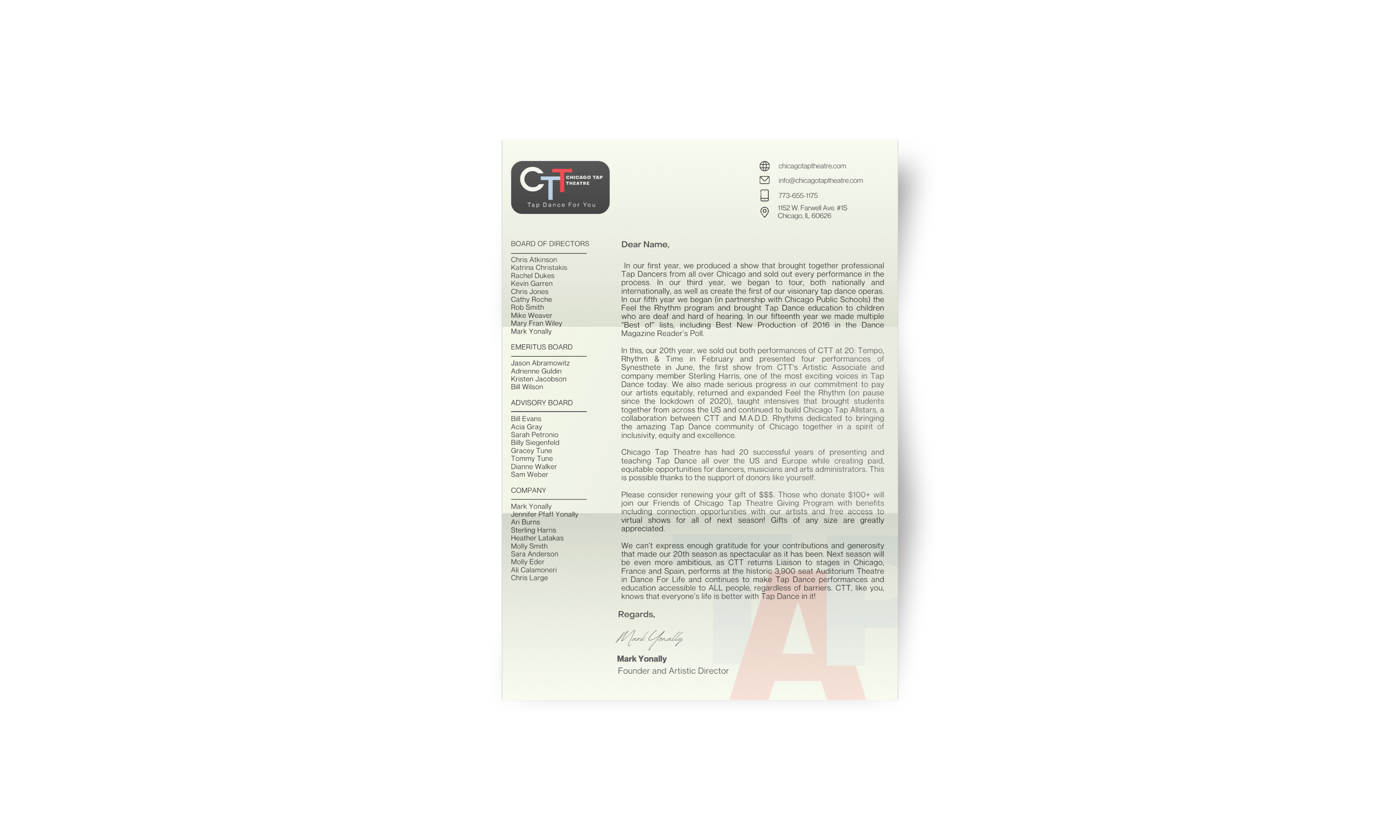 Chicago Tap Theatre approached me with the desire to revitalize its brand, marking the anticipation of its momentous 20-year celebration. We assessed the existing messaging, refocusing the vision to crystallize the trajectory that the next two decades of tap would encompass at CTT. The visual brand was another high-level focus as Founder Mark Yonally wanted fresh representation that resonates with CTT's future direction while embodying the essence of the art form.